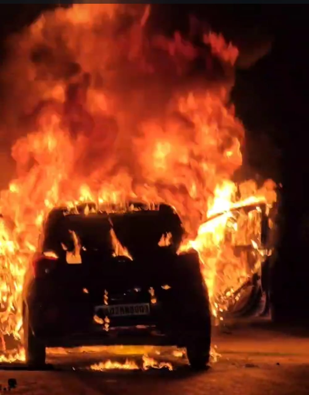 Pune: A moving car suddenly caught fire, reducing the vehicle to ashes. Fortunately, no casualties were reported. The incident occurred around 9:30 PM on Monday in front of Ashoka Hotel at Dapodi Chowk.