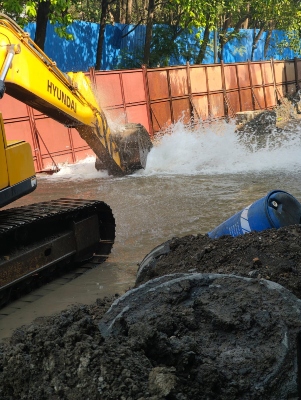 The MahaMetro project, extending from Pimpri to Nigdi, involves pillar excavation between Bhakti-Shakti Chowk and Kalbhor Chowk in Akurdi. The construction has been progressing rapidly for the past several months. However, the mishap occurred when a drill machine unintentionally struck the underground pipeline, causing a high-pressure water leak.